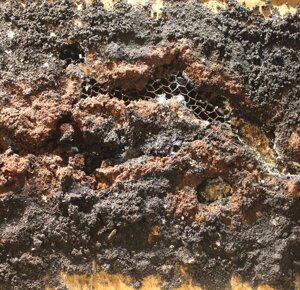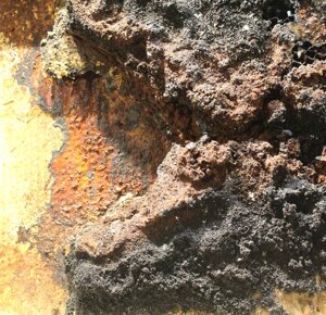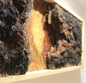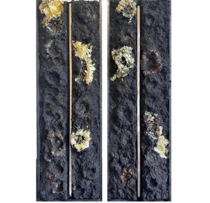 Tecnica: Mista con pigmenti, ferro, cenere vulcanica, foglia oro su cartone di riciclo con interventi di fiamma